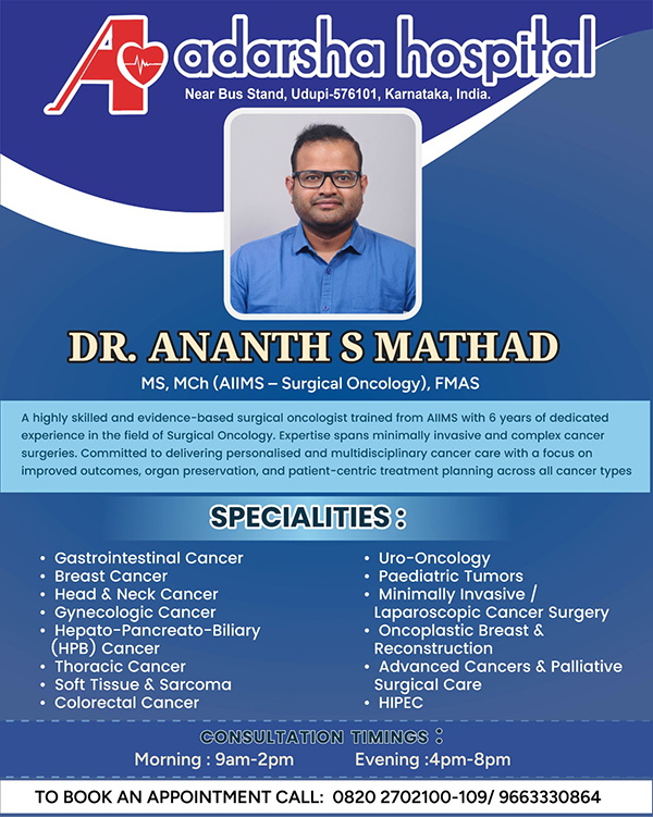 Udupi, Dec 15: Dr Ananth S Mathad, a specialist doctor with nearly 20 years of distinguished service in the medical field, has newly joined the Surgical Oncology Department of Adarsha Hospital, located near the city service bus stand.