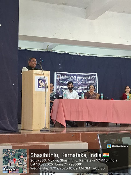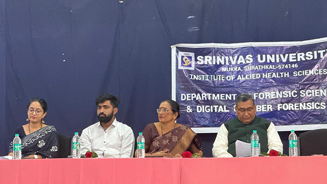 Dr Swathi D, head of the departments of Forensic Science and Digital & Cyber Forensic Science, welcomed the gathering and highlighted the objectives of the workshop. Prof Pavana Krishna Murthy, dean, Srinivas Institute of Allied Health Sciences, stressed the importance of interdisciplinary learning and hands-on exposure in forensic education. Dr Sucheta Kumari N, research director, Srinivas University, spoke on equipping students with industry-oriented skills to enhance employability and research outcomes.