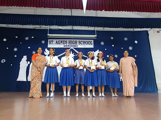 The students who won the first place in 'Navidad' organized by St Agnes College (Autonomous) were felicitated. The headmistress Sr Gloria AC congratulated the class teacher Roopa Shetty for guiding the students. She even appreciated the efforts of the students in presenting a meaningful Christmas programme.