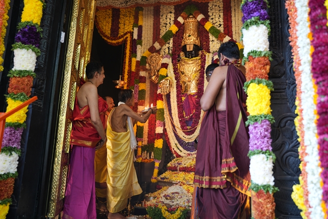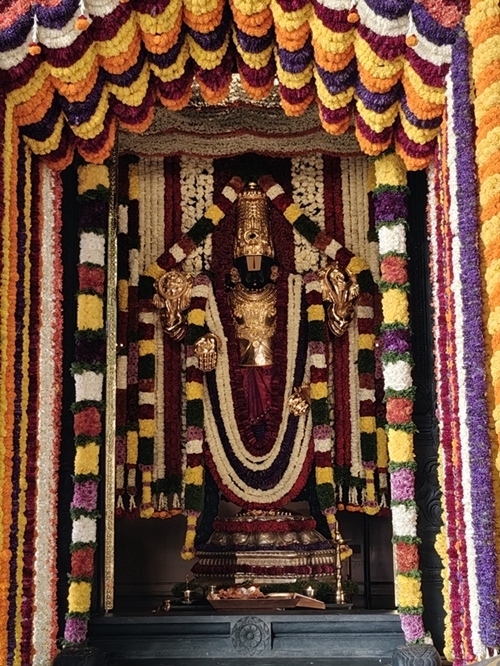 The daily pooja was performed from 8:45 am to 9 am, followed by bhajana seva. From 10 am, Laksha Pushparchana (offering of one lac flowers) was offered with great devotion to Lord Srinivasa. At 12:30 p.m., the Mahapooja was offered, after which prasada was distributed to the devotees.