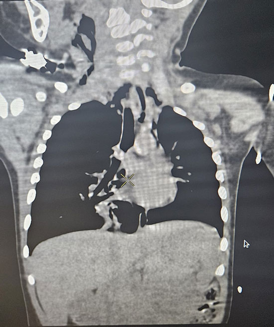 Upon arrival at KMC Hospital, the child was assessed by Dr Swathi Rao, consultant - paediatric intensivist, who immediately recognized the seriousness of the condition. Despite initial hesitation from the family, the child’s respiratory status worsened, with oxygen saturation falling to 88 percent and visible distress. An urgent CT scan of the thorax confirmed a foreign body obstructing the right bronchus, resulting in hyperinflation of the right lung and compression of the left lung and heart.