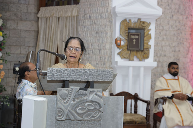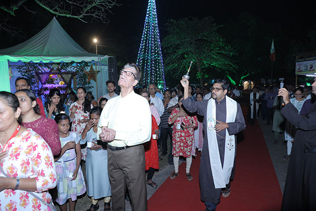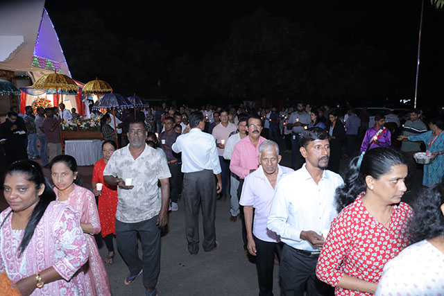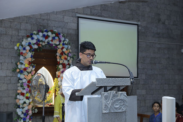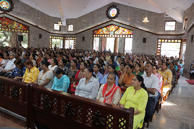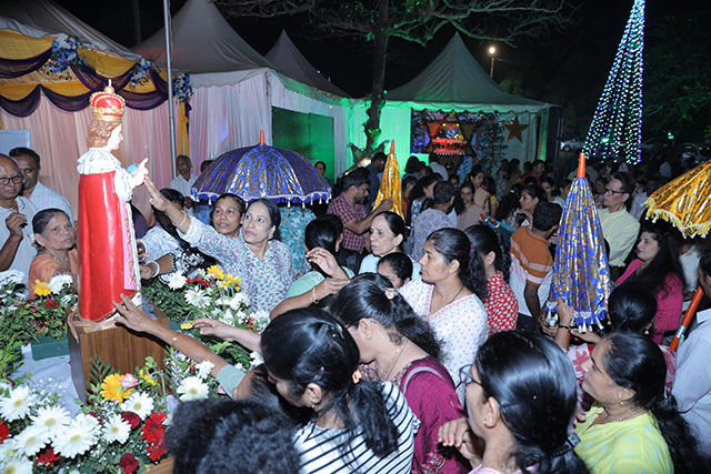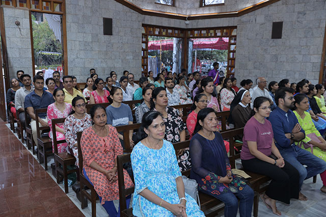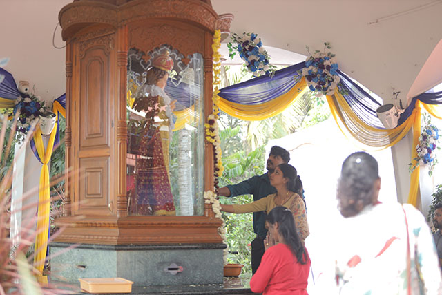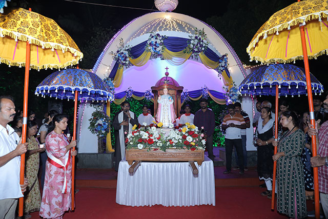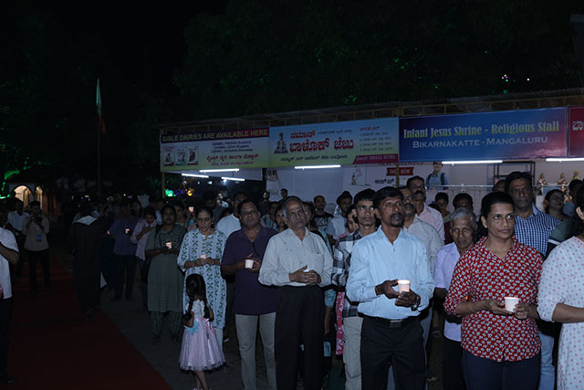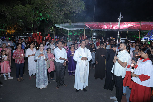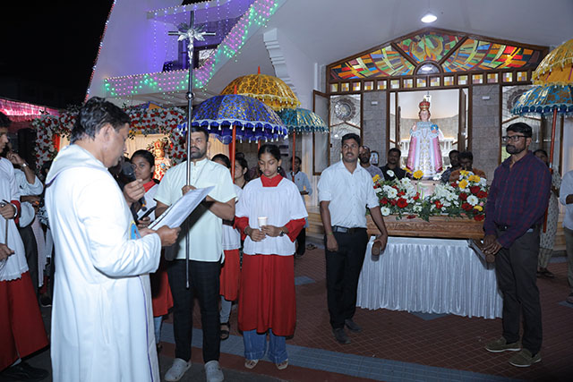 The English Mass at 5:00 pm was celebrated by Fr Noel D’Almeida, OFM Cap. The 6:00 pm evening Mass was solemnized by Fr Roshir D’Souza, director of Mangala Jyothi. The final Mass of the day at 7:45 pm was celebrated by Fr Anthony Stephen, OCD, from Mysuru.