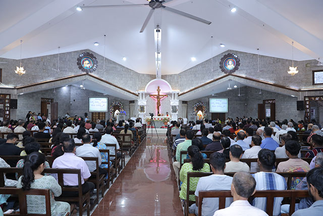 The day began with the 6:00 am Mass celebrated by Fr Alwyn Sequeira, OCD, editor of Uzavad, the fortnightly of the Udupi diocese. The 7:30 am prayer service was led by Fr Movin Pereira from Ramnagar-Londa, followed by the 9:00 am Mass presided over by Fr Arun Mark, a Pallottine priest and parish priest of Farla Parish. The main solemn Eucharistic celebration at 10:30 am was offered by Fr Boniface Pinto, spiritual director of Divya Dham Seminary, Moodubelle, who also led the faithful in prayer, worship and Eucharistic adoration.