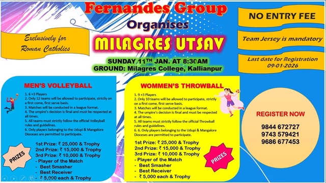 The multi-discipline sports tournament will feature exciting competitions in volleyball and throwball. Participation is exclusively open to Roman Catholic teams from the Dioceses of Mangaluru and Udupi, providing a common platform for talented players from both dioceses to showcase their skills and competitive spirit.