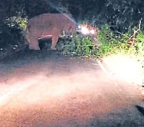 Beltangady, Jan 10: A wild elephant was spotted on the Charmadi Ghat road between the second and third hairpin bends on Friday night, causing a traffic jam for more than an hour.