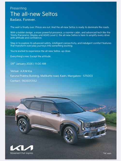 Mangaluru, Jan 10: Kia India on Friday showcased its All-New Kia Seltos at A R M Kia, Mangaluru offering customers the opportunity to experience the next-generation mid-SUV. Reinforcing Kia’s commitment to design leadership, advanced safety and progressive technology, the All-New Kia Seltos is being launched at a price starting Rs 10.99 lac (ex-showroom).