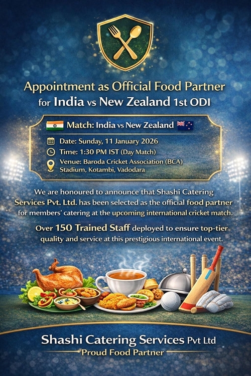 The company will provide its first hospitality service for the historic India vs New Zealand first One Day International cricket match, scheduled to be held on Sunday, January 11, at 1:30 pm (IST) at the Baroda Cricket Association (BCA) Stadium, Kotambi, Vadodara. Expressing pride in contributing to such a prestigious sporting event, Shashidhar B Shetty, chairman and managing director of Shashi Catering Services Pvt. Ltd. (SCSPL), said the organisation is fully prepared to ensure the success of the tournament.