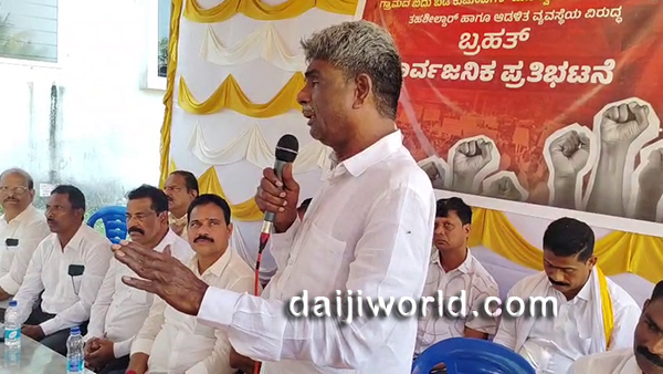 The protest was organised in front of the Brahmavar tahsildar’s office against the tahsildar and the administrative system after the houses of five poor families from Heggunje village, who had been residing on government land for nearly 20 years, were demolished. Several local residents of Heggunje participated in the protest and insisted that they would not vacate the premises until justice was delivered.