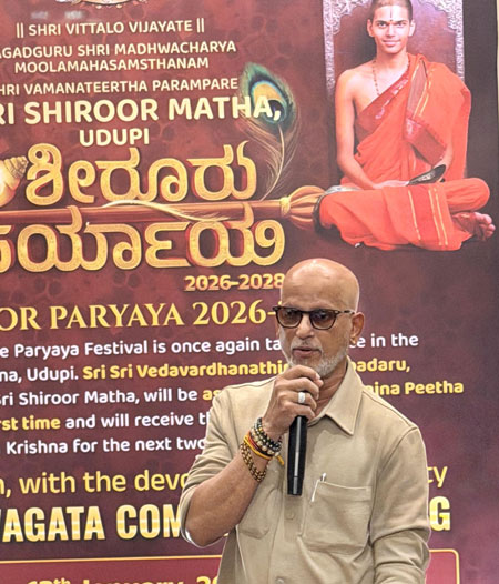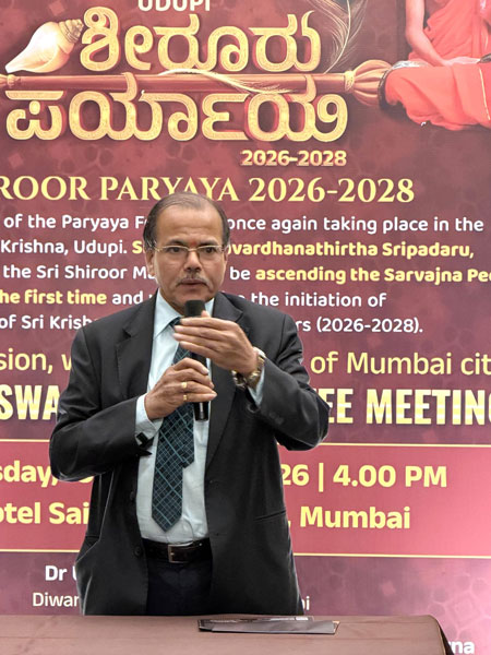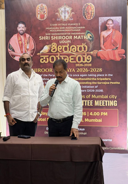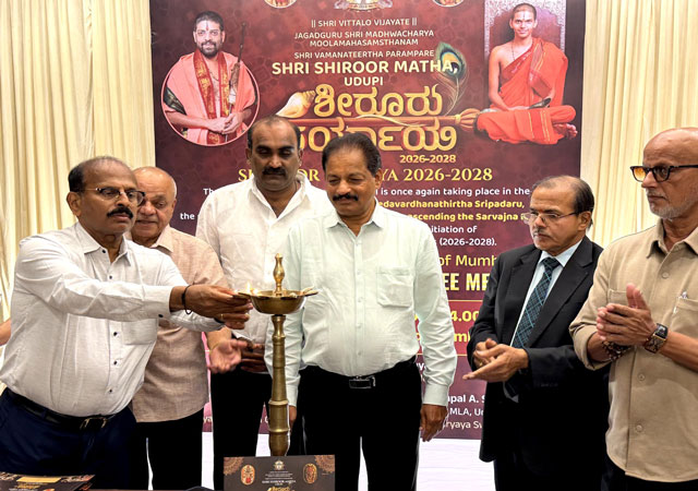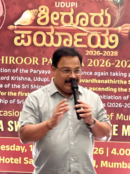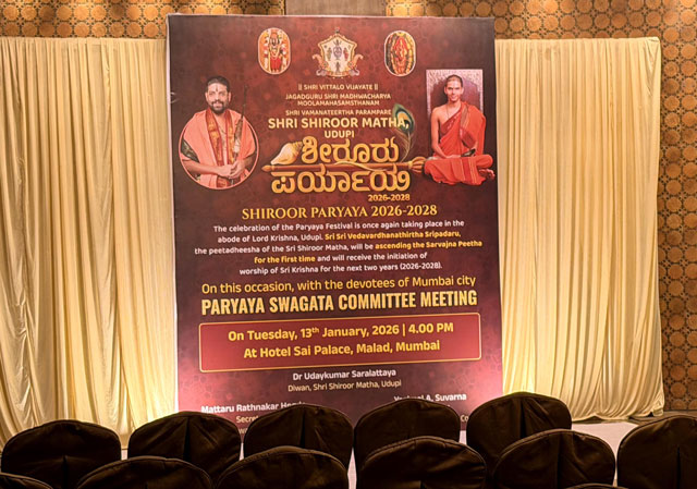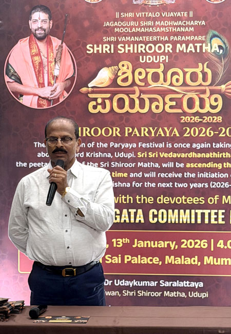 Mumbai, Jan 13: Udupi Paryaya is world-famous. This time, the celebrations will be held with a blend of social and cultural harmony, making it a Paryaya of and for the devotees of Udupi. All devotees should come forward and help make the first Sarvajna Peetharohana (Paryaya) of Udupi Shiruru mathadhipathi, Shri Vedavardhanatirtha Shripada of the Jagadguru Shri Madhwacharya Moola Mahasamsthanam, Shri Vamana Tirtha tradition, a grand success, said Udupi MLA and president of the Paryaya welcome committee Yashpal A Suvarna.