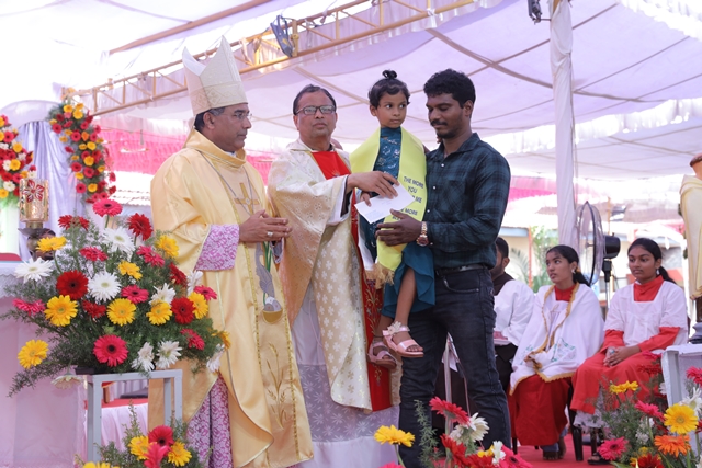A total of five holy Eucharistic celebrations were held in Konkani and Malayalam to accommodate the large number of pilgrims. The highlight of the day was the solemn festal Mass for children at 10 am, presided over by Rt Rev Dominic Dias, bishop of Karwar. Children had gathered in great numbers for this special celebration, which was entirely organised and animated by them.