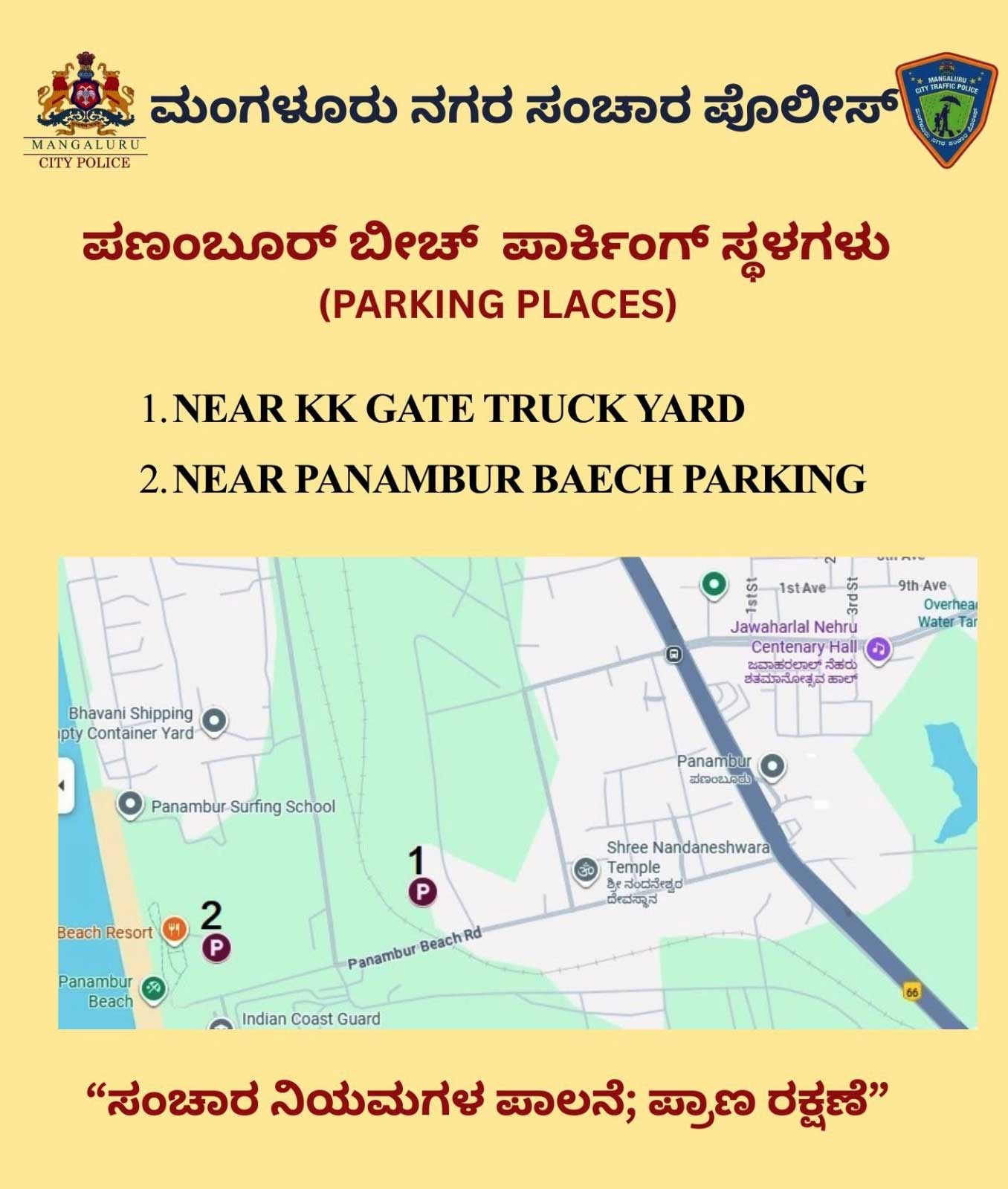 During the event hours, parking will not be permitted on either side of the road from Kudremukh Junction to Panambur Junction and from Dikki Cross to Panambur Beach. Designated parking facilities for the Panambur Beach events include the K K Gate truck yard parking area and Panambur Beach parking.