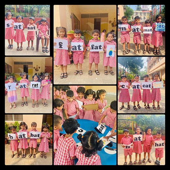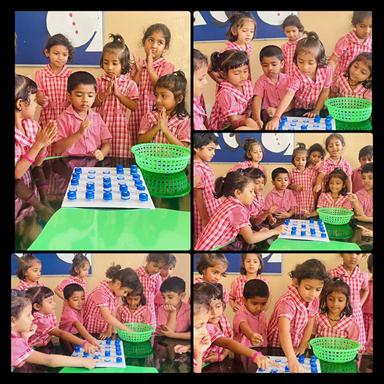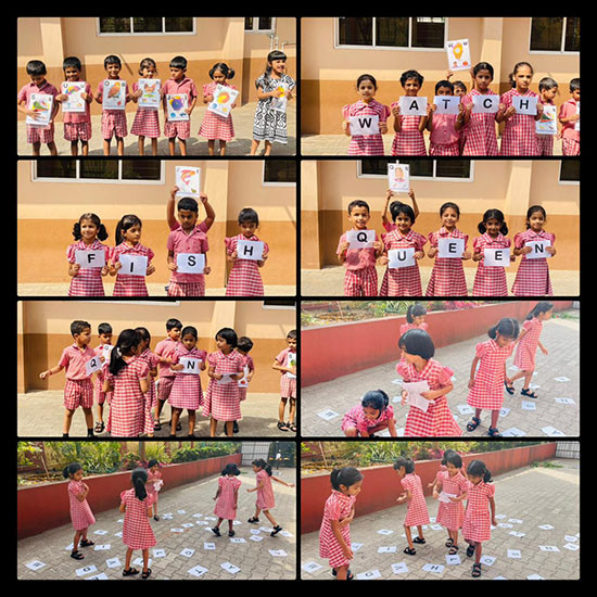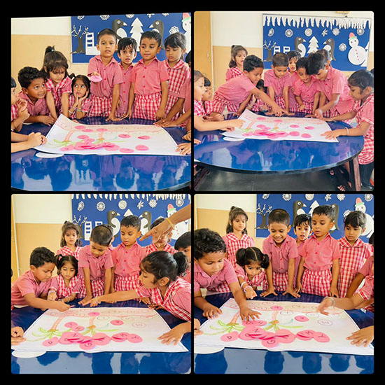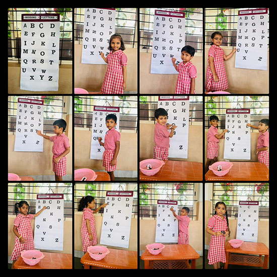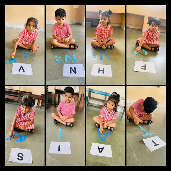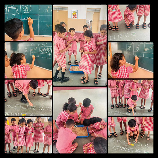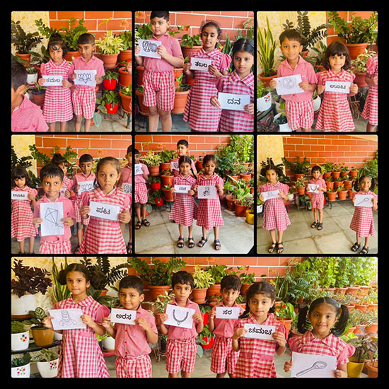 For Kannada language learning, children were asked to match Kannada letters with the correct pictures. They also enjoyed hunting for Kannada letters, which strengthened their familiarity with the Kannada alphabet. Additionally, students were shown pictures and guided to match them with the correct Kannada words, making the learning process interactive and enjoyable.