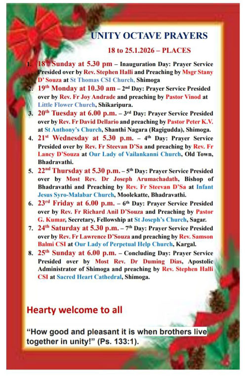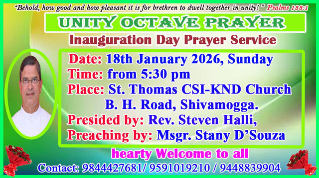Shivamogga, Jan 19: A week-long Octave of Prayer for Christian Unity from January 18 to 25, 2026, was inaugurated in the diocese of Shimoga. It is based on the theme from Saint Paul's Letter to the Ephesians: "There is one body and one Spirit, just as you were called to the one hope of your calling" (4:4).