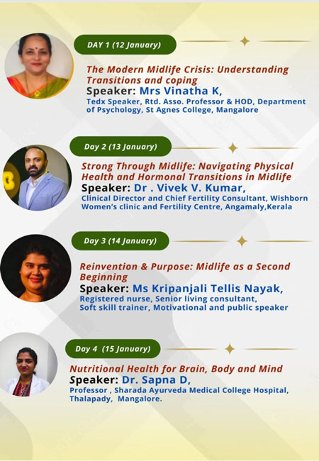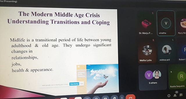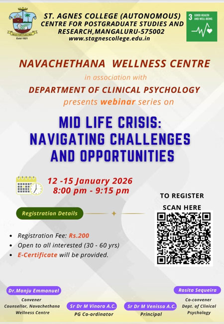 Mangaluru, Jan 20: Navachethana Wellness and Counselling Centre in collaboration with the Department of Clinical Psychology, St Agnes College (Autonomous), conducted an expert webinar series titled ‘Midlife Crisis: Navigating Challenges and Opportunities’ from January 12 to 15 between 8 pm and 9 pm via Google Meet.