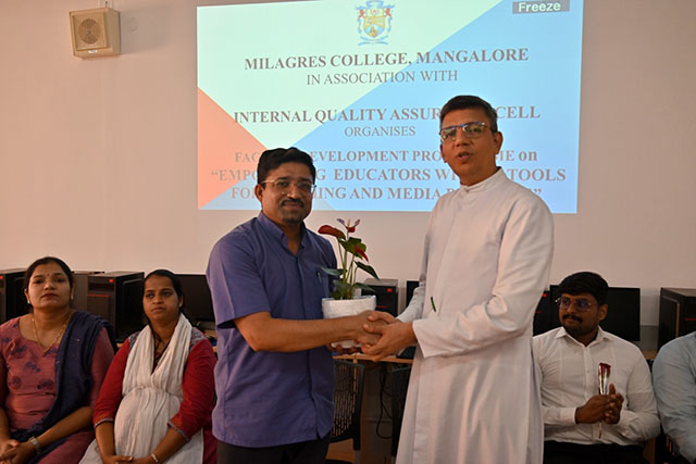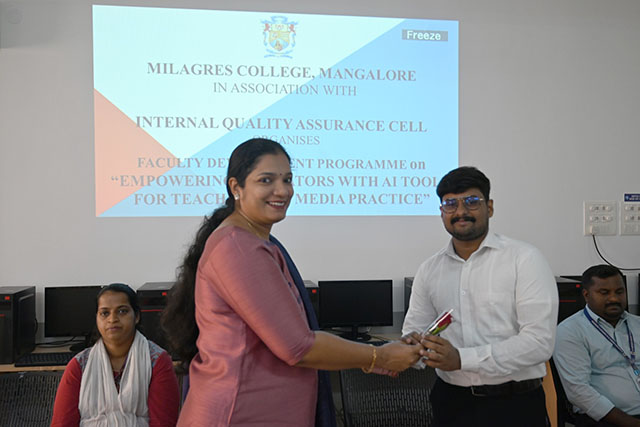 Mangaluru, Jan 21: Milagres College, Hampankatta, Mangaluru, in association with its Internal Quality Assurance Cell (IQAC), and in collaboration with St Aloysius College Deemed to be University, Mangaluru, and Leaf Academy, organised a one-day Faculty Development Programme titled 'Empowering Educators with AI Tools for Teaching and Media Practice' on Tuesday, January 20, at the college computer laboratory.
