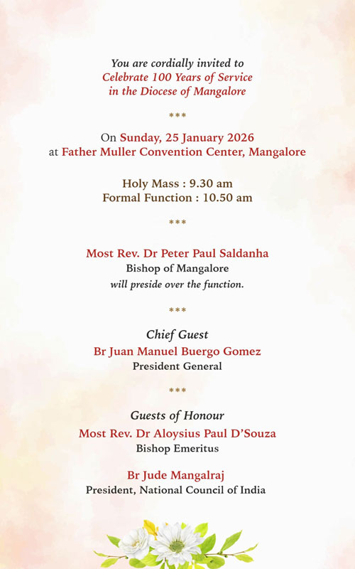 Members of the Karnataka Legislative Council Ivan D’Souza, director of Father Muller Charitable Institutions Fr Faustine Lucas Lobo, and renowned entrepreneur and philanthropist Joseph Elias Menezes will also grace the occasion as guests of honour. In addition, Santiago Manickam, national secretary of SSVP, Asha Vaz, and youth representative Alister Nazareth will be present on the dais.