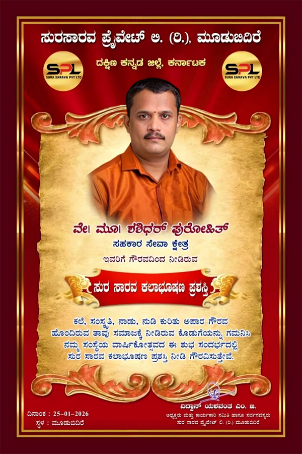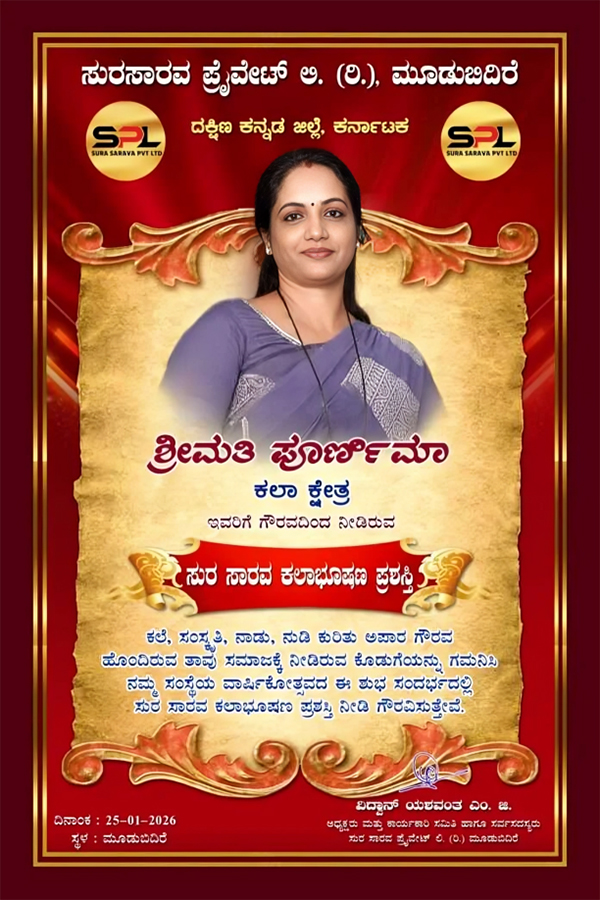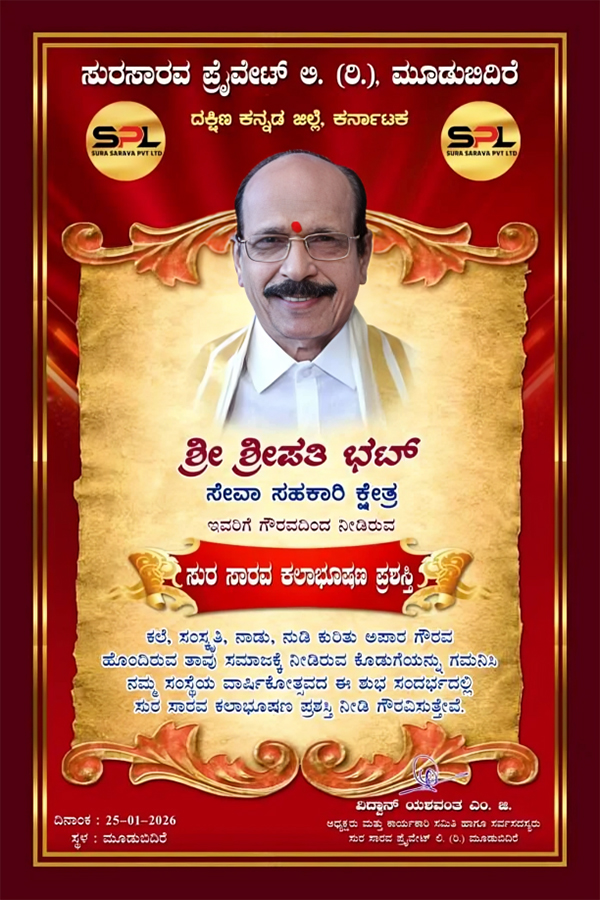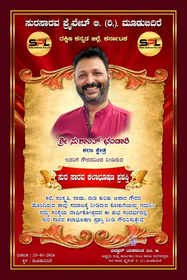 On this occasion, the “Sura Sarava Award” will be conferred upon Alwyn Andrade for his valuable contribution to art, culture, and society. Noted entrepreneur, social worker, and philanthropist K Sripathi Bhat will be honoured for his exemplary service to society. Poornima Udupi will be recognised for her achievements in the field of arts. Veda Moorthi Shashidar Purohit will receive the award for his remarkable contribution to social service, while Sushanth Bhandary will be honoured for his dedication to the field of art.