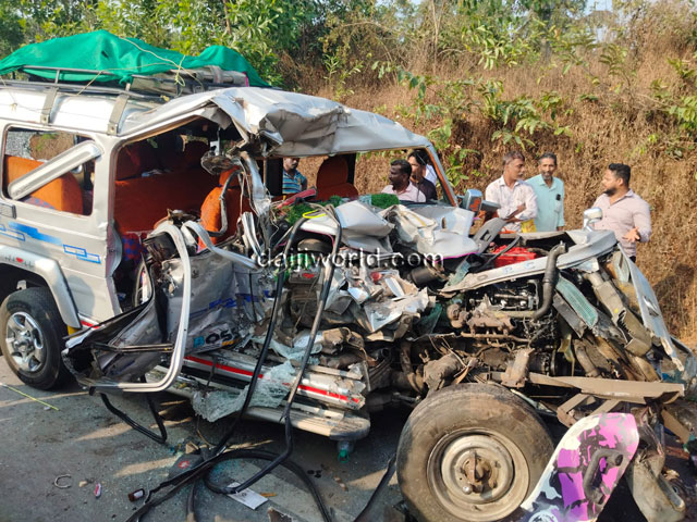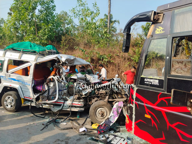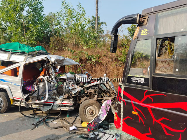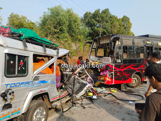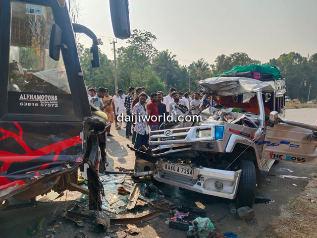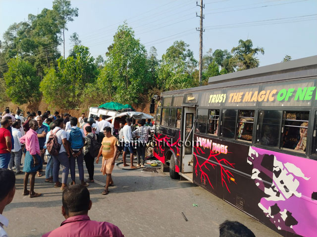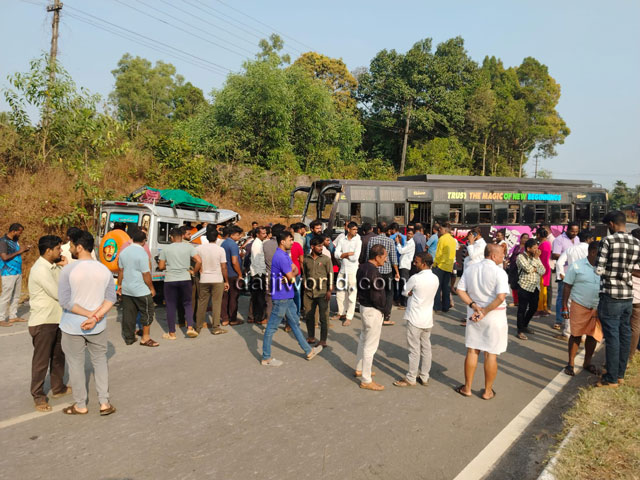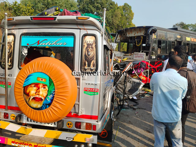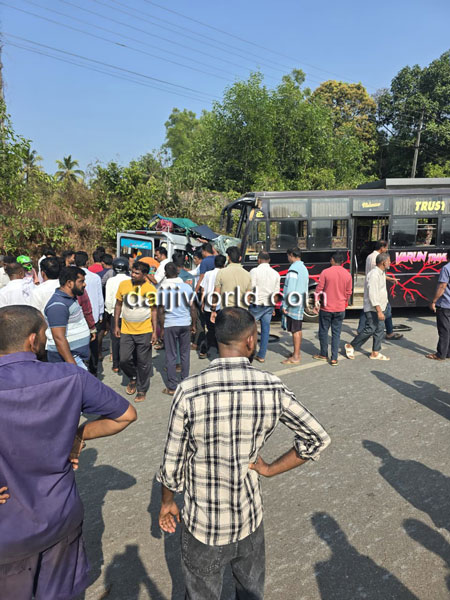According to preliminary information, a private bus travelling from Dharmasthala towards Karkala is alleged to have been driven at high speed and entered the wrong side of the road near Miyar Kambala Cross. The bus reportedly rammed head-on into an SUV heading from Karkala towards Beltangady..