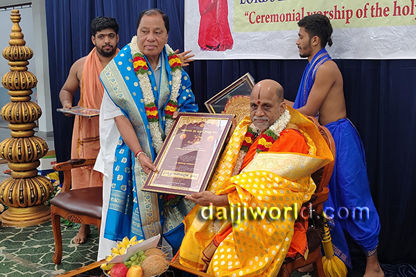 Bhuvanendra Kidiyoor honoured Sri Sugunendra Teertha Swamiji by presenting the Sri Krishna Geethanugraha Award on the occasion.