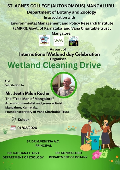 Mangaluru, Feb 2: In a heartfelt initiative, students and faculty members of the Department of Botany and Zoology, St Agnes College (Autonomous), Mangaluru, joined hands with Vana Charitable Trust, Mangaluru, and the Environmental Management and Policy Research Institute (EMPRI), Government of Karnataka, to raise awareness about wetland conservation. They organised a large-scale wetland cleaning drive to commemorate World Wetland Day.