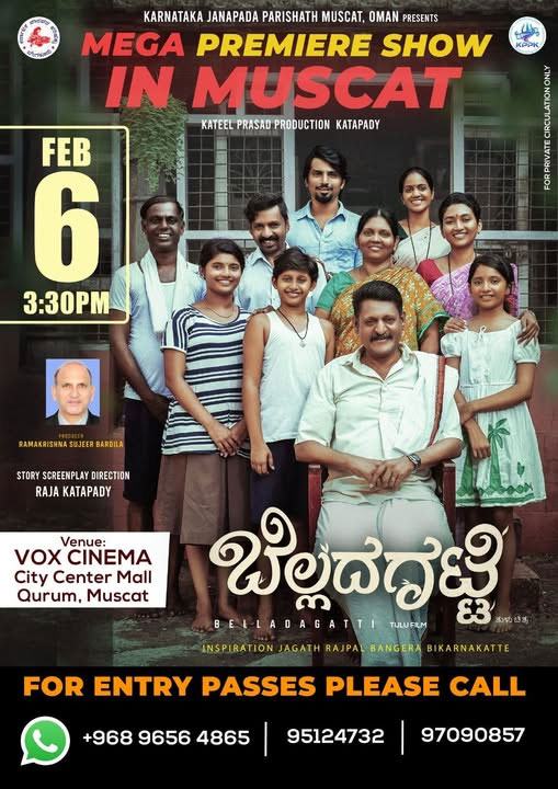 Muscat, Feb 3: The mega premiere show of Tulu film ‘Bellada Gatti’ will be held in Muscat on February 6. The film will be screened at Vox Cinema, City Centre Mall, Qurum at 3.30 pm.