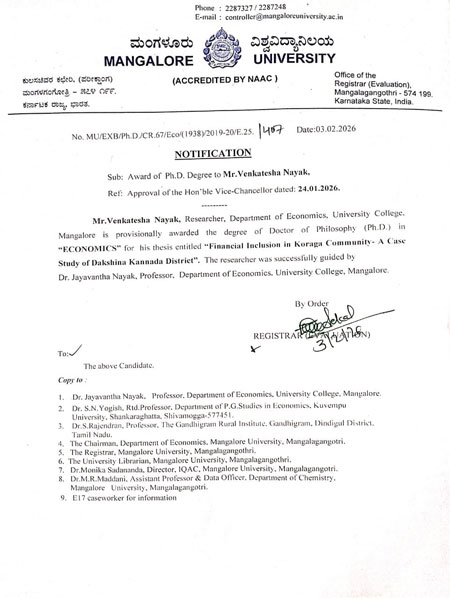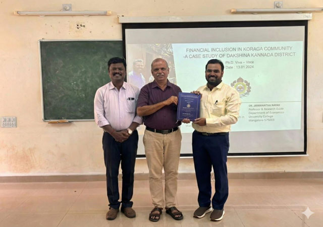 The research was carried out under the guidance of Dr Jayavantha Nayak, professor of economics, University College, Mangaluru. The thesis was evaluated by the external examiner Dr S N Yogish, professor and chairman, department of PG Studies in Economics, Kuvempu University, who also conducted the viva voce examination and one more external examiner was Dr Rajendran, senior professor and department of economics head, Gandhigram Rural Institute, Tamil Nadu.