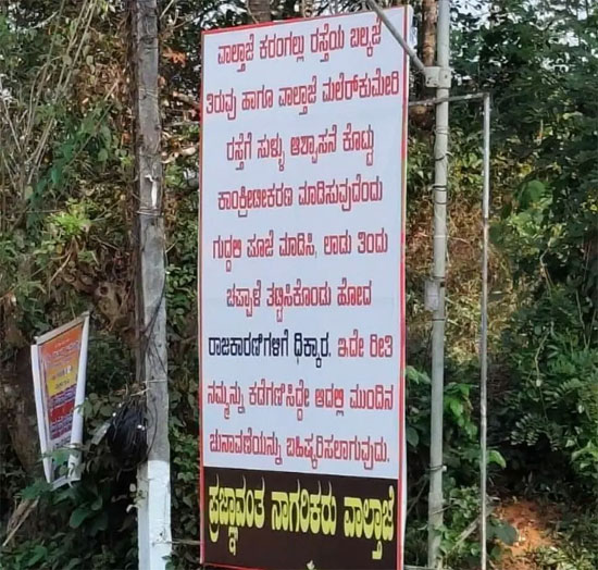 To express their protest, villagers installed a banner stating, “Shame on the politicians who gave us false assurances about concreting the Valthaje–Karangallu road at the Balkaje turn and the Valthaje–Malerkumeri road, performed a guddali puja, ate laddus and left after taking applause. As we have been neglected in this manner, we will boycott the next election.”