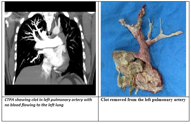 Process: An incision is made in the pulmonary artery, and clots are manually removed.