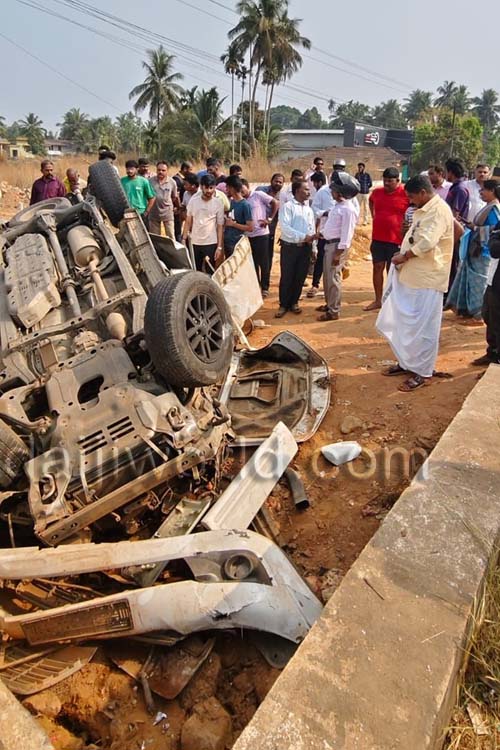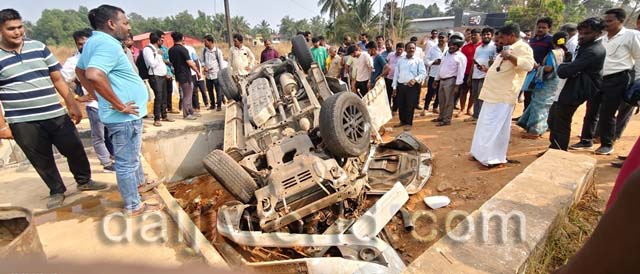 Kundapur, Feb 9: Six students sustained serious injuries after a Fortuner car overturned and plunged into a roadside drain on the opposite carriageway of National Highway-66 near Kannukere, in front of the Navashakti Kalyana Mantapa on Monday, February 9.