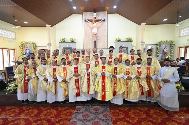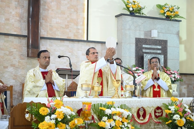 Fr Ivan Michael Rodrigues, vicar forane of Vittal Deanery (St John Paul II), Fr Anil Canute D'Mello, parish priest of Mogarnad, Fr Naveen Prakash Pinto, principal of Deva Matha English Medium School, and deacon Avil Santhmayor assisted during the celebration.