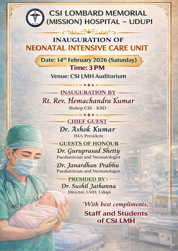 Udupi, Feb 13: A Neonatal Intensive Care Unit (NICU) will be inaugurated at CSI Lombard Memorial (Mission) Hospital (LMH), Udupi, on February 14 at 3 pm at the CSI LMH Auditorium.