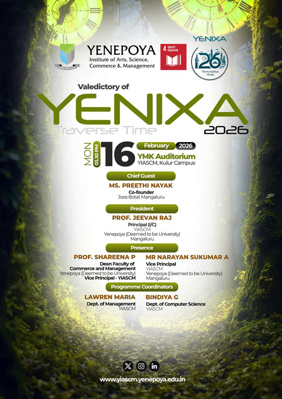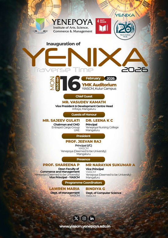 The inaugural ceremony of YENIXA 2026 will be held in the presence of Vasudev Kamath, vice president & development centre head, Infosys, Mangaluru, as the chief guest. The occasion will also be graced by Sajeev Gulati, chairman and CMD, Entrepot Cargo Group, UAE, and Dr Leena K C, principal, Yenepoya Nursing College, Mangaluru, as the guests of honour. The programme will be presided over by Prof Jeevan Raj, principal (I/C), YIASCM, Prof Shareena P, vice principal and dean, faculty of Commerce and Management, Narayan Sukumar A, vice principal, heads of Departments, faculty members, support staff, and students.