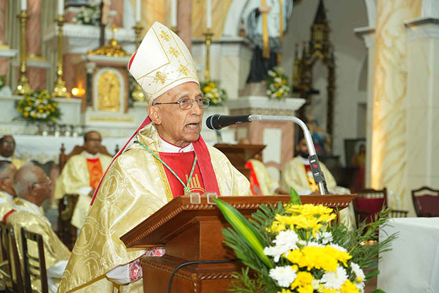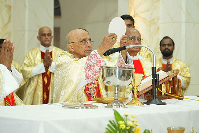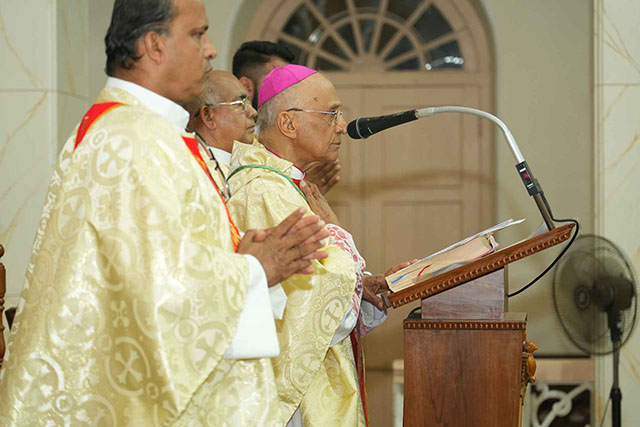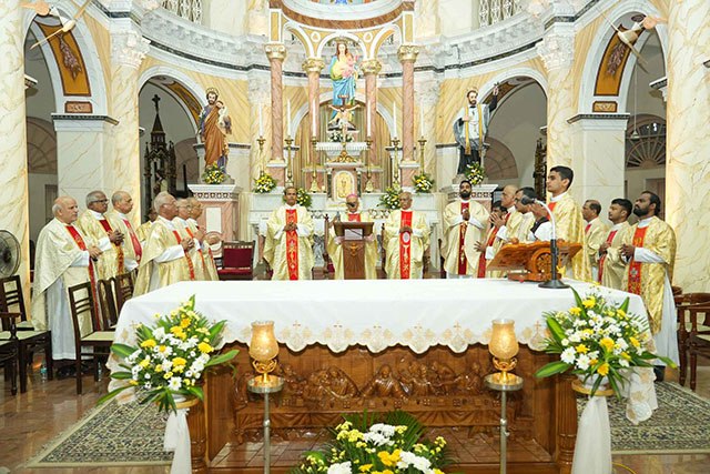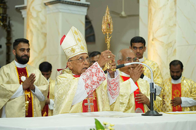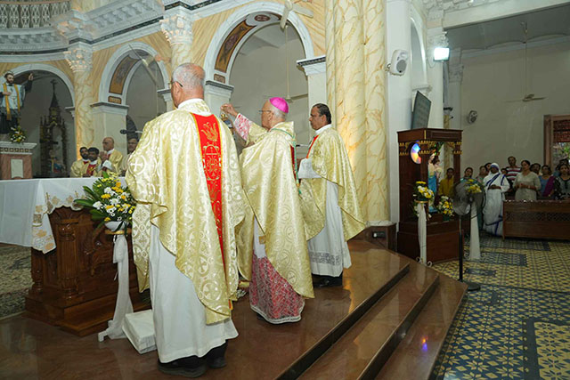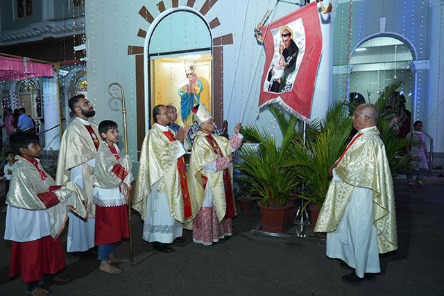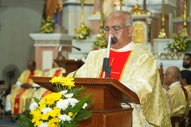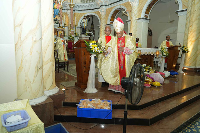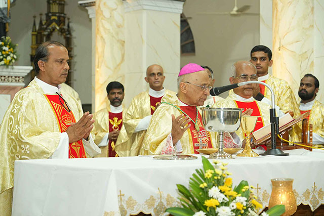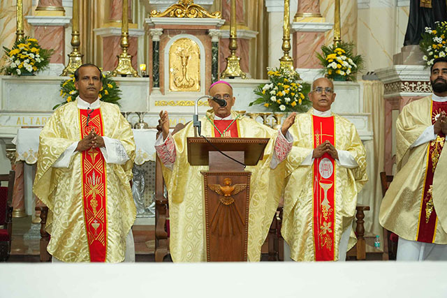 Mangaluru, Feb 16: The annual Relic Feast of St Anthony of Padua culminated in a majestic display of devotion and spiritual fervour at St Anthony’s Shrine, Milagres, on Sunday evening, February 15. Thousands of devotees from across the district thronged the shrine to participate in the Solemn Festal Mass presided over by Dr Bernard Moras, archbishop emeritus of Bangalore.