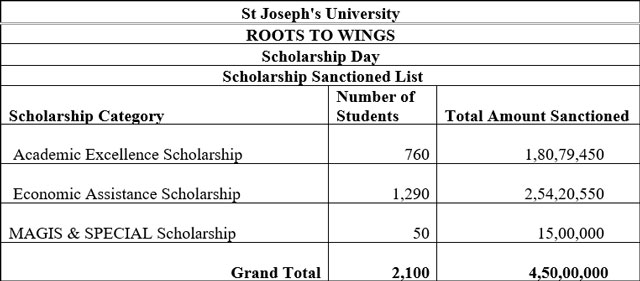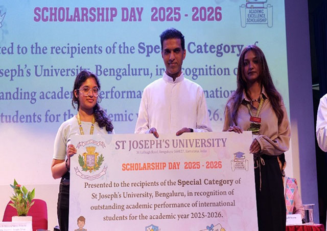 Bengaluru, Feb 17: St Joseph's University hosted 'Roots to Wings', the first Scholarship Day of the University, at the SJU Main Auditorium on Friday, celebrating academic excellence and the transformative power of education. The event brought together administrators, faculty, students, and distinguished guests to honour scholarship recipients and reaffirm the institution’s commitment to holistic development.