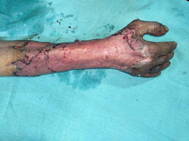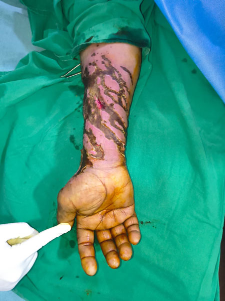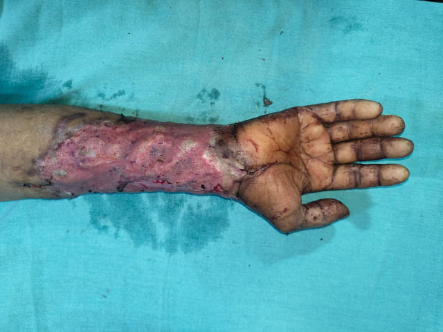 Mangaluru, Feb 17: The plastic surgery team at Father Muller Medical College Hospital, successfully treated and restored the forearm of a 58-year-old NRI patient who suffered severe chemical burns following an accidental sulphuric acid spillage at his workplace in Dubai.