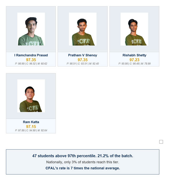 1 in every 12 CFAL students is in the national Top 1%: With 18 students crossing the 99th percentile from a batch of 217, CFAL’s conversion rate is 8 times the national average. More remarkably, nearly 1 in every 5 CFAL students (21.2%) is in the 97th percentile or above, a tier that nationally, only 3% of students reach.