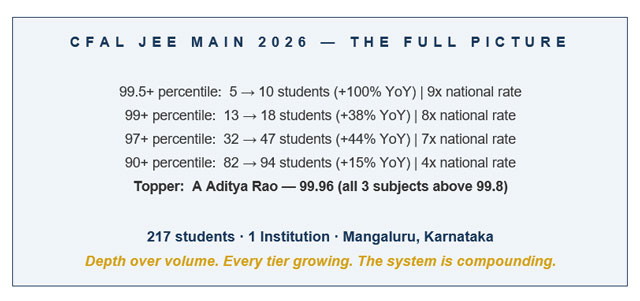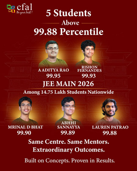 Mangaluru, Feb 19: The Centre for Advanced Learning (CFAL) in Mangaluru has emerged as the topper in Dakshina Kannada for the JEE Main 2026 results. From a focused batch of 217 students, the institution recorded a 100% year-on-year surge in the elite 99.5+ percentile tier.