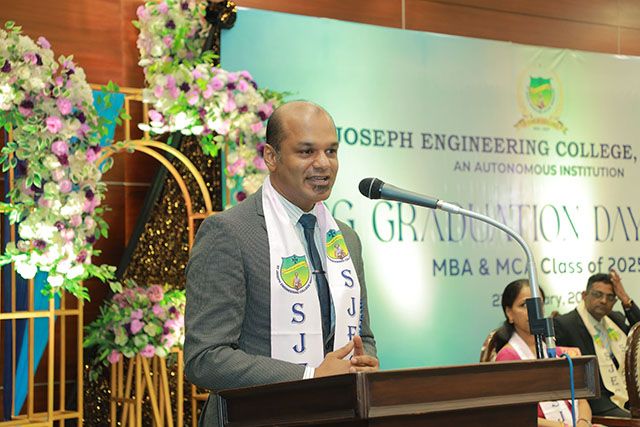 John Rohan, in his address, said that SJEC is not just an institution but a foundation that shapes one’s future. Recalling project deadlines and teamwork from his student days, he emphasised that a postgraduate degree is a responsibility that demands leadership, ethical thinking and continuous learning.