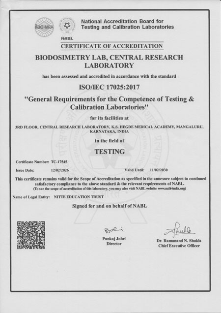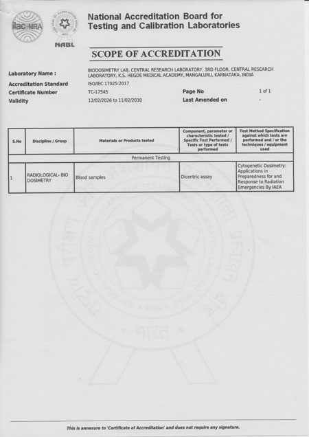 Mangalutu, Feb 25: The Biodosimetry Laboratory available at the Central Research Laboratory of K S Hegde Medical Academy has been granted accreditation by NABL (National Accreditation Board for Testing and Calibration Laboratories) under the ISO/IEC 17025:2017 standard in the field of Radiological Testing.