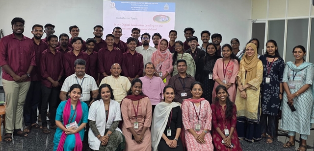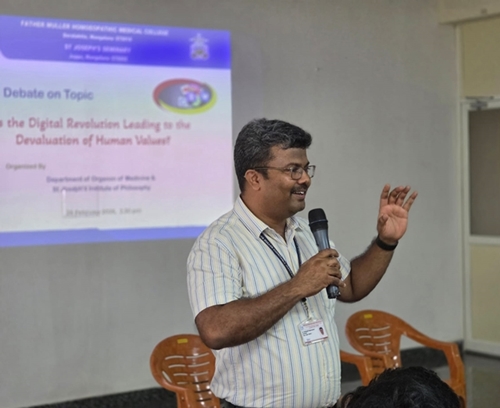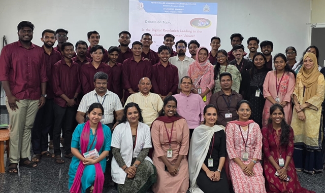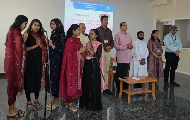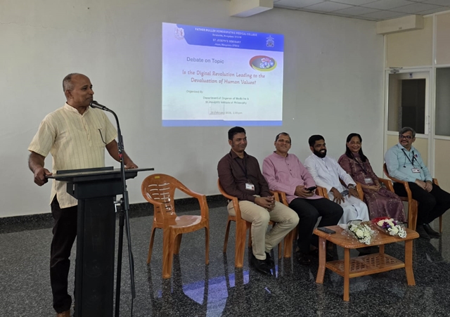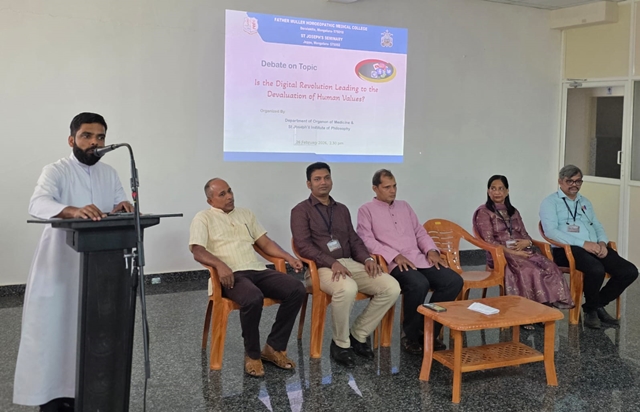 Mangaluru, Feb 26: St Joseph’s Institute of Philosophy (SJIP), in collaboration with Father Muller Homeopathic Medical College (FMHMC), organized a joint debate on the theme, “Is the Digital Revolution Leading to the Devaluation of Human Values?” The programme was held on February 26 at the Father Muller Seminar Hall, Deralakatte, Mangaluru. The event brought together students of philosophy and medicine for an engaging academic exchange on a topic of contemporary relevance.