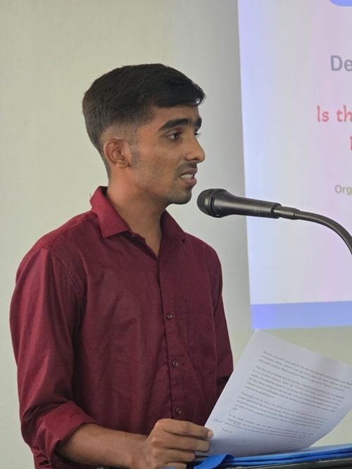 The programme began with a prayer song led by the students of Father Muller Homeopathic Medical College. Fr Donald Nelesh Crasta then delivered the welcome address, expressing his appreciation for the joint initiative and emphasizing the importance of examining contemporary concerns through responsible and thoughtful discussion. The debate was moderated by Dr R C Rajendra, professor in the Department of Practice of Medicine, who guided the proceedings with balance and clarity. The formal debate commenced with introductory remarks from representatives of both institutions, each presenting their initial stand on the theme. These opening reflections set the direction for the structured exchange of arguments that followed.
