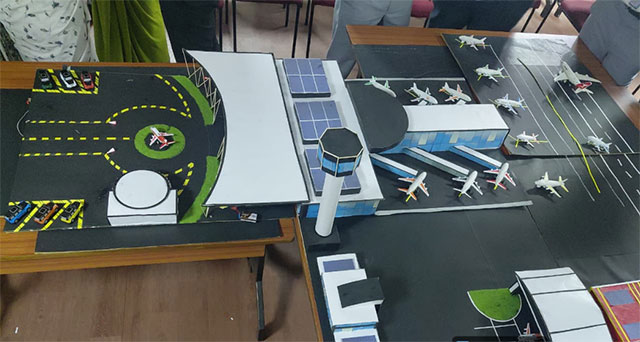 Students actively participated in designing comprehensive airport layout models that covered both landside and airside operations. The models included key components such as runways, taxiways, aprons, terminal buildings, ATC towers, parking areas, and passenger facilities. Through their presentations, students explained aircraft movement areas, passenger flow systems, security arrangements, baggage handling, and ground operations, reflecting their understanding of airport infrastructure and coordination.