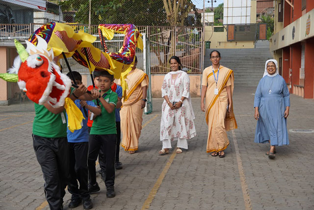 The programme began on a grand note with the arrival of the chief guest, Sr Vidya, vice principal of the school, along with the principal, Sr Lourdes, and Sr Chrisette. They were ceremoniously escorted to the dais through a lively dragon procession, adding colour and excitement to the occasion.