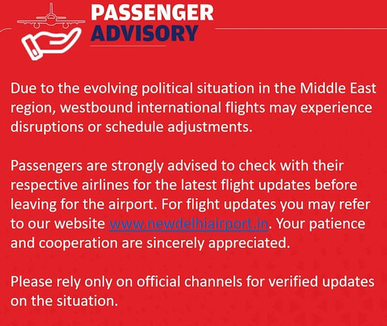 Delhi’s Indira Gandhi International Airport issued alerts for Middle East international air routes, warning that flights to western destinations could face delays, diversions, or cancellations.