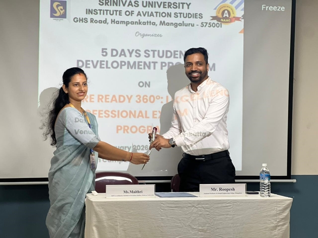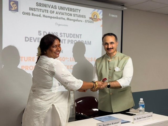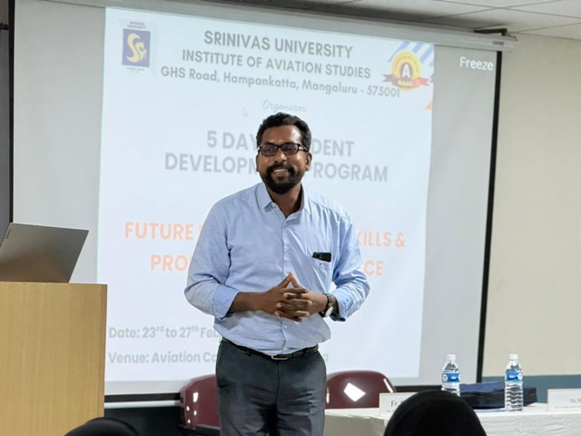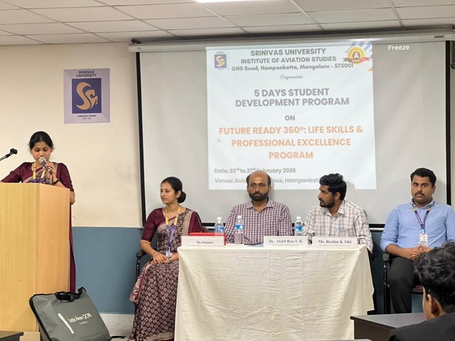 Mangaluru, Mar 2: The Srinivas University Institute of Aviation Studies, successfully organised a comprehensive five-days student development program titled “Future Ready 360°: Life Skills & Professional Excellence” from February 23 to 27, at Aviation Campus, Hampankatta, Mangaluru. Designed to equip students with a blend of technical knowledge, professional competence, and essential life skills, the program aimed at preparing young aviation aspirants to meet the dynamic demands of the global aviation industry. A total of 60 students from MBA Aviation Management, BBA Aviation Management, and BBA Aviation and Logistics Management participated in the program.