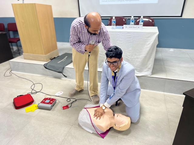 The final day emphasized operational knowledge and safety. Arun Kumar M discussed airport check-in procedures and industry challenges, Vaishak Subramanian covered aviation security and dangerous goods handling, and Dr Akhil Rao U K concluded the program with a practical session on CPR and emergency response. Overall, the program successfully achieved its aim of preparing students with industry-relevant skills and holistic professional development.