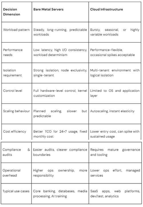 Bare metal offers certainty, performance isolation, predictable throughput, and deep control. Cloud offers velocity, autoscaling, abstraction, and speed. Indian enterprises that win are the ones that understand both deeply and deploy them intentionally.