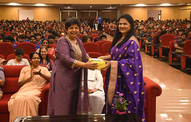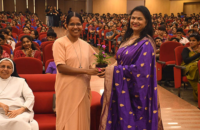 The dignitaries on the stage included the administrator, Sr Carmel Rita AC; the vice principal, Sr Dr M Roopa AC; the chief guest, Dr Malini Hebbar; the vice president, Carol Pais; and the secretary, Anusha Noronha.