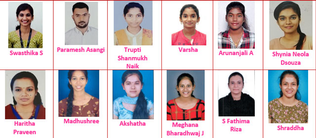 In BPharm Trupti Shanmukh Naik secured overall 3rd rank and Varsha secured overall 8th rank. Further, Trupti Shanmukh Naik secured 7th rank in III Sem, 6th rank in IV Sem, 5th rank in V sem, 3rd rank in VI sem, 5th rank in VII sem, 3rd rank in VIII sem and Varsha secured 4th rank in III sem and 8th rank in VII sem. Madhushree secured 3rd rank in I sem, 1st rank in VI sem, Akshatha secured 6th rank in I sem and 8th rank in II sem, Meghana Bharadwaj J secured 8th rank in IV sem, S Fathima Riza secured 7th rank in V sem, Shraddha secured 7th rank in VI sem as detailed by Dr A R Shabaraya, principal & director of the college.