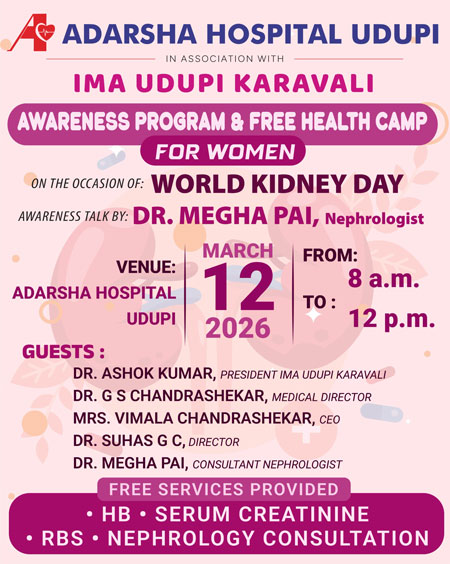 Udupi, Mar 11: On the occasion of World Kidney Day, Adarsha Hospital, Udupi, in association with IMA Udupi Karavali will organize an awareness and free health camp for women on March 12 at 8 am in the Adarsha Hospital Udupi.